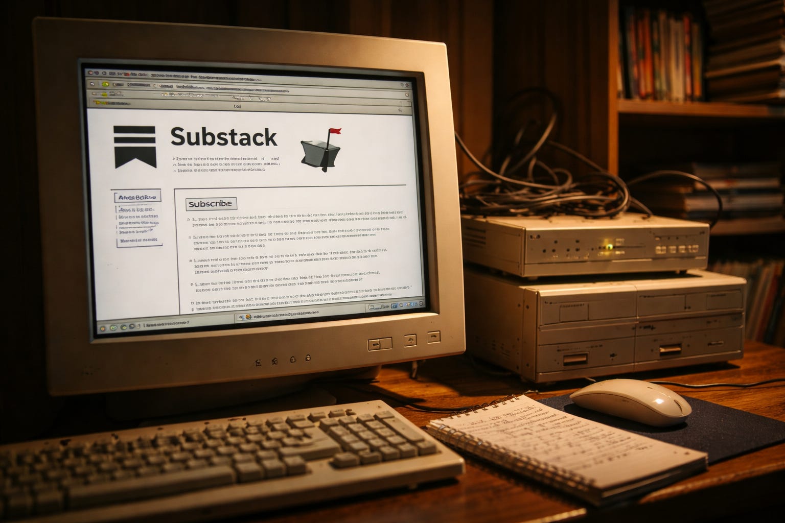 Dim bedroom lit by a CRT monitor. On the screen: a clunky early-web page. Grey background. Table layout. Blue hyperlinks. At the top, a tiny black Substack icon made of three pixel bars and one jagged little flag. Right next to it, maybe a spinning mailbox gif going at war with your migraine.